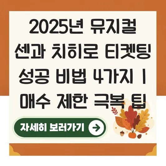 기업의 문제 해결 프로세스를 분석할 때, 가장 먼저 하는 일은 '정보의 비대칭성'을 해소하는 것입니다. <센과 치히로의 행방불명> 뮤지컬 티켓팅도 마찬가지죠. 많은 사람이 '운'이라고 생각하지만, 전략을 알면 성공률을 획기적으로 높일 수 있습니다. 1인 4매 매수 제한을 뚫고 원하는 자리를 얻는 비법, 지금부터 실전 전문가의 관점에서 분석해 보겠습니다.
